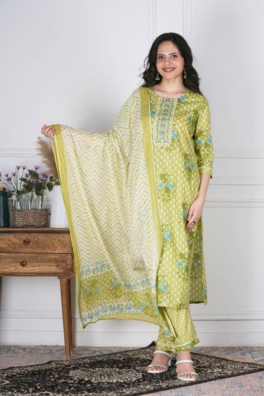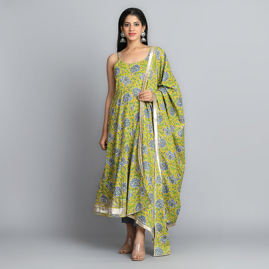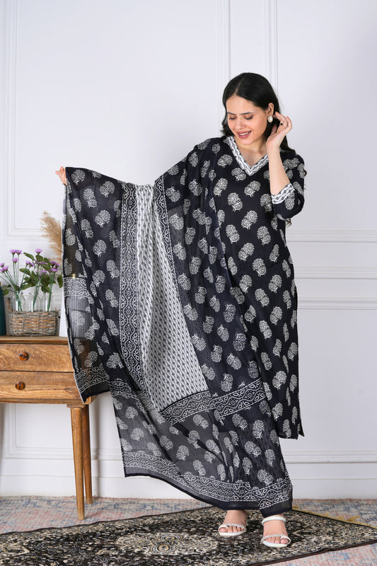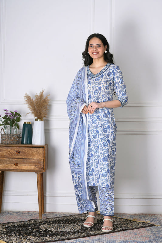 Dhara White and Blue Handblock Print Cotton Suit Set