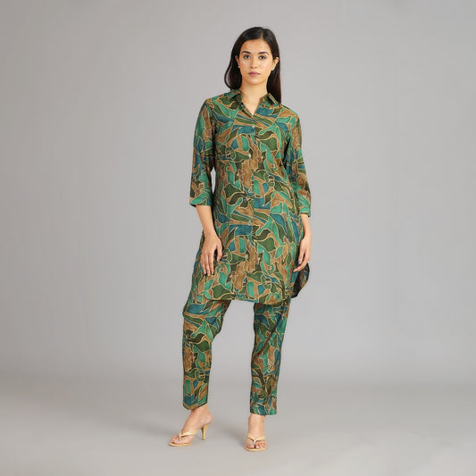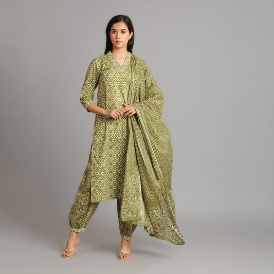 Moss Green & Gold V-Neck Afghani Suit Set – 3pc