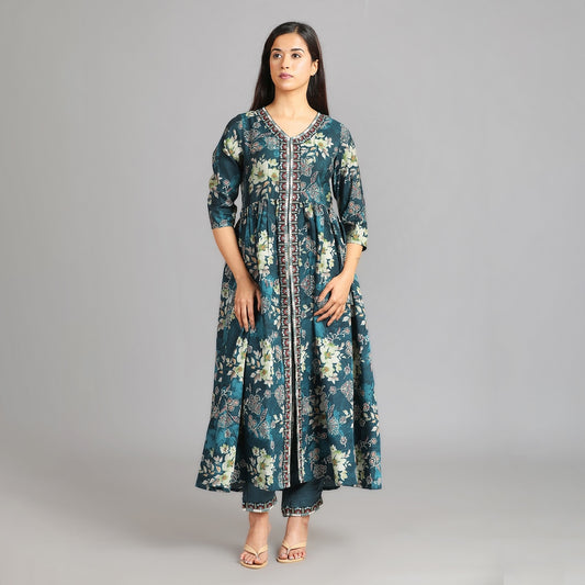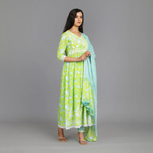 Neerja Light Green Cotton Angarkha Style All-Over Embroidery Suit Set – 3pc