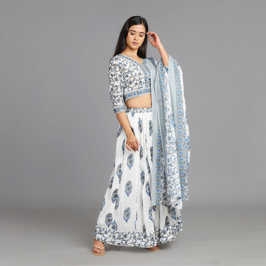 White, Blue and Grey Mul Cotton Crop Top & Skirt Set with Dupatta – 3pc