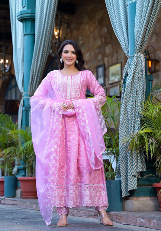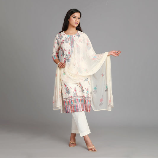 Off White & Pink Square Schiffli Cotton Suit Set with Chiffon Dupatta– 3pc