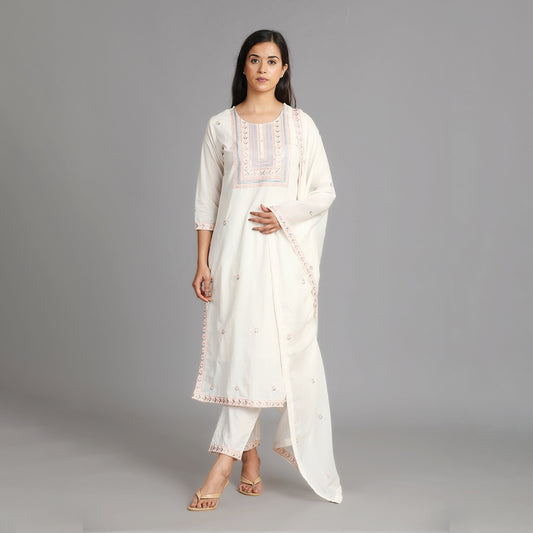 Off-White Cotton Suit Set with All Over Embroidery and Heavy Neckline– 3pc