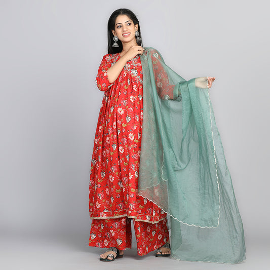 Vanya Red Alia Style Suit with Green Organza Dupatta