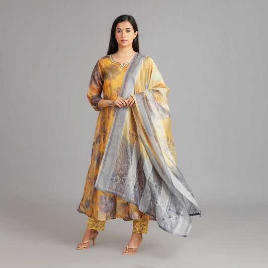 Mustard Yellow Chanderi Anarkali Suit Set with Embroidered Neckline– 3pc