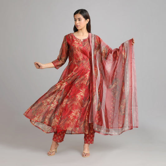 Crimson Chanderi Anarkali Suit Set with Embroidered Neckline
