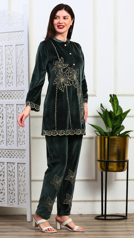 Shakti Dark Green Muslin Suit Set With Embroidered Neck and Gotapatti Dupatta– 3pc